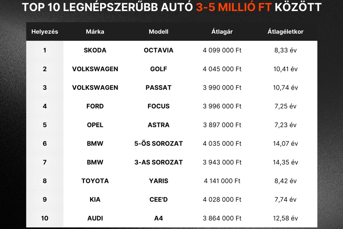 Mint a Használtautó.hu legújabb kutatásából kiderül, ebben az árszegmensben Magyarországon idén toronymagasan vezet a Skoda Octavia, a 3200 aktív online hirdetésre nem kevesebb mint 18 ezer érdeklődő jutott. Az egyébként újonnan – főleg cégautóként – is igen kedvelt cseh autó sikere nem meglepő, jó ár-érték arányát, minőségét, tágas utas- és csomagterét, illetve széles választékát nagyra értékelik a vásárlók. Mögötte, a képzeletbeli dobogóra a VW Golf, illetve Passat került, már tíz év feletti átlagos korral, míg a BMW-k és Audik vásárlói a még régebbi évjárattól és az átlagosan akár 240-280 ezer kilométeres futásteljesítménytől sem riadnak vissza. Ázsiai modellből csak kettő, a Toyota Yaris és a Kia Ceed került fel a toplistára.