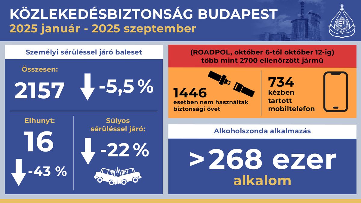 Az év első kilenc hónapjában 2157 személyi sérüléssel járó közúti baleset történt a fővárosban, ami 5,5 százalékkal kevesebb a tavalyi év azonos időszakához képest – jelentette be Léránt Krisztián r. alezredes, a Budapesti Rendőr-főkapitányság közlekedésrendészeti főosztályának vezetője október 14-én.
