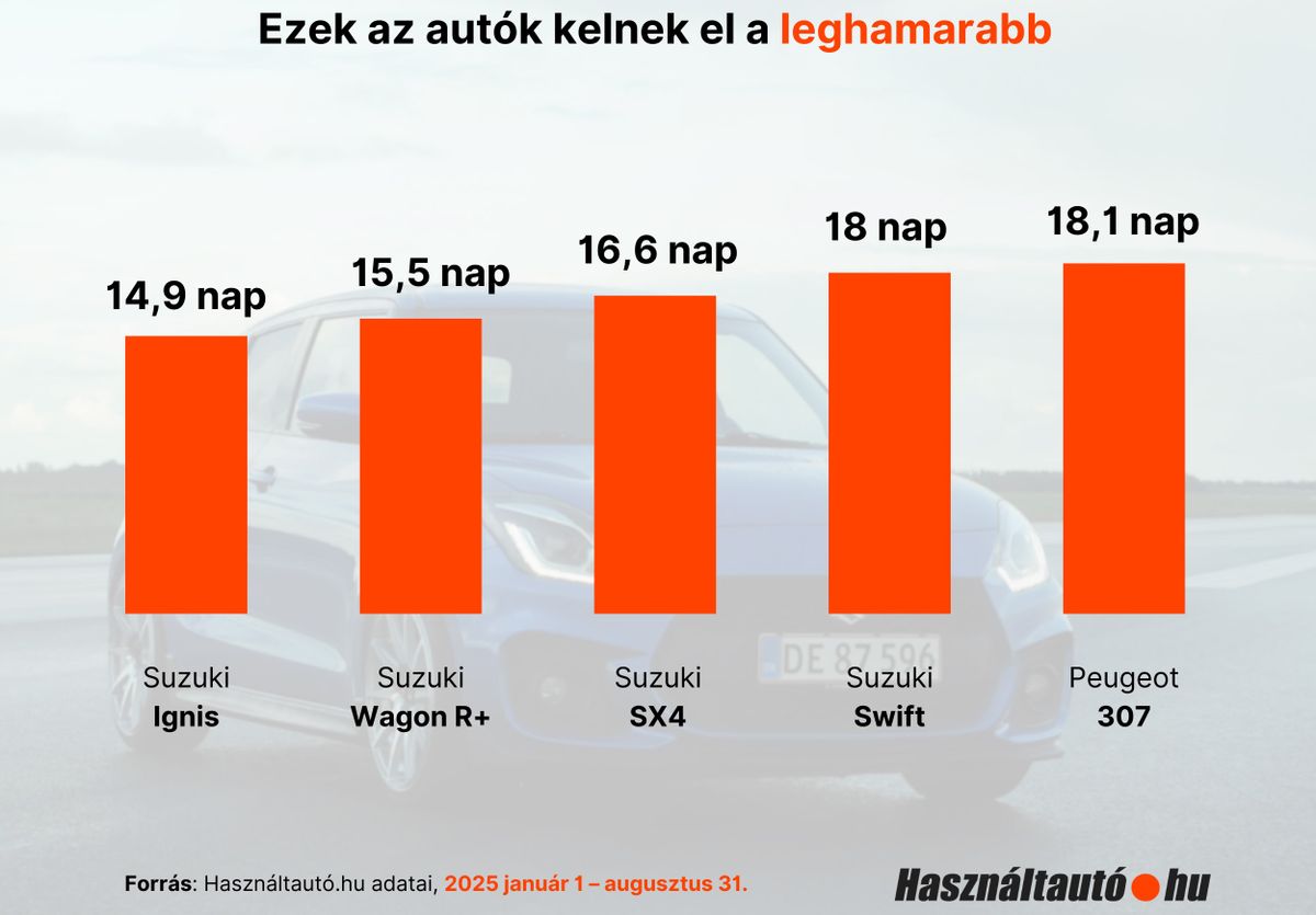 Megvizsgálták ugyanis, mely modellek cserélnek gazdát a leggyorsabban a magyar használtautó-piacon; a forgási sebességet - vagyis a „turnover” értéket - úgy számolták, hogy átlagosan hány nap telik el a hirdetés felkerülésétől a levételéig. A leghamarabb eladható típusok listáját pedig a Suzuki vezeti: az Ignis mindössze 14,9 napos átlagos eladási idővel áll az első helyen, szorosan mögötte a Wagon R+ (15,5 nap) és az SX4 (16,6 nap.) következik. Negyedik helyen áll a Swift 18 napos átlagos turnover-idővel, és csak ötödiknek futott be egy más márka modellje, a kedvező árú Peugeot 307.