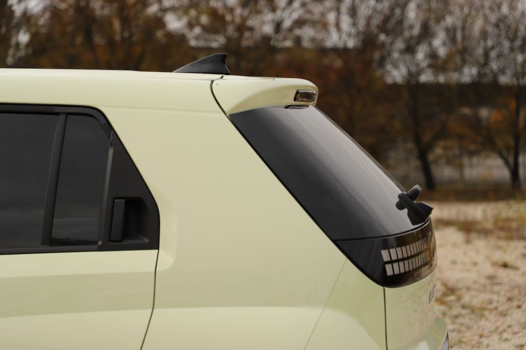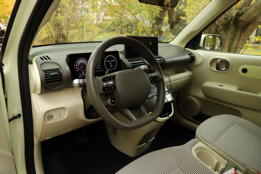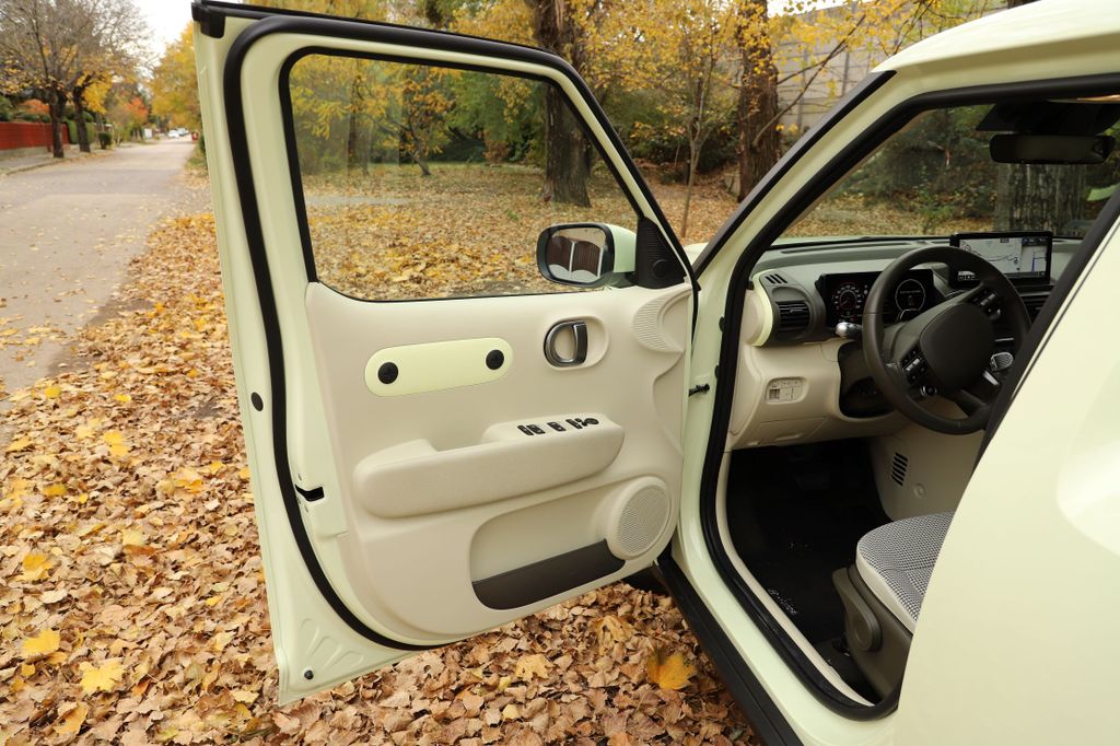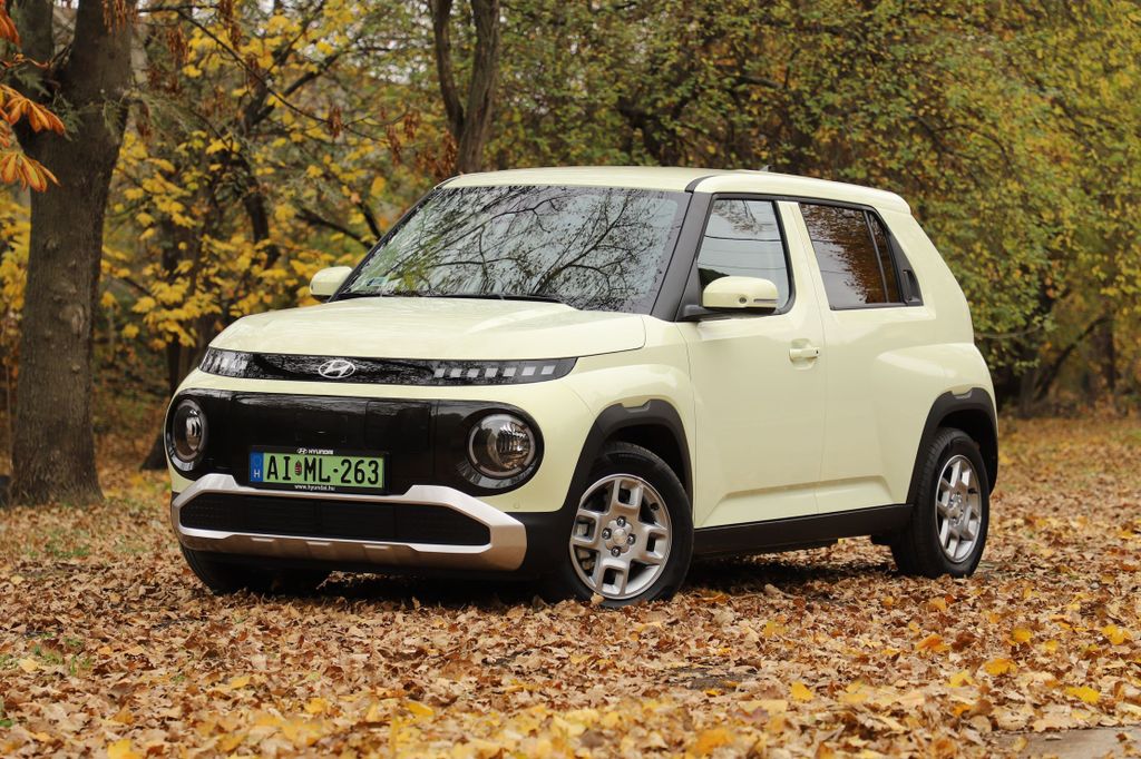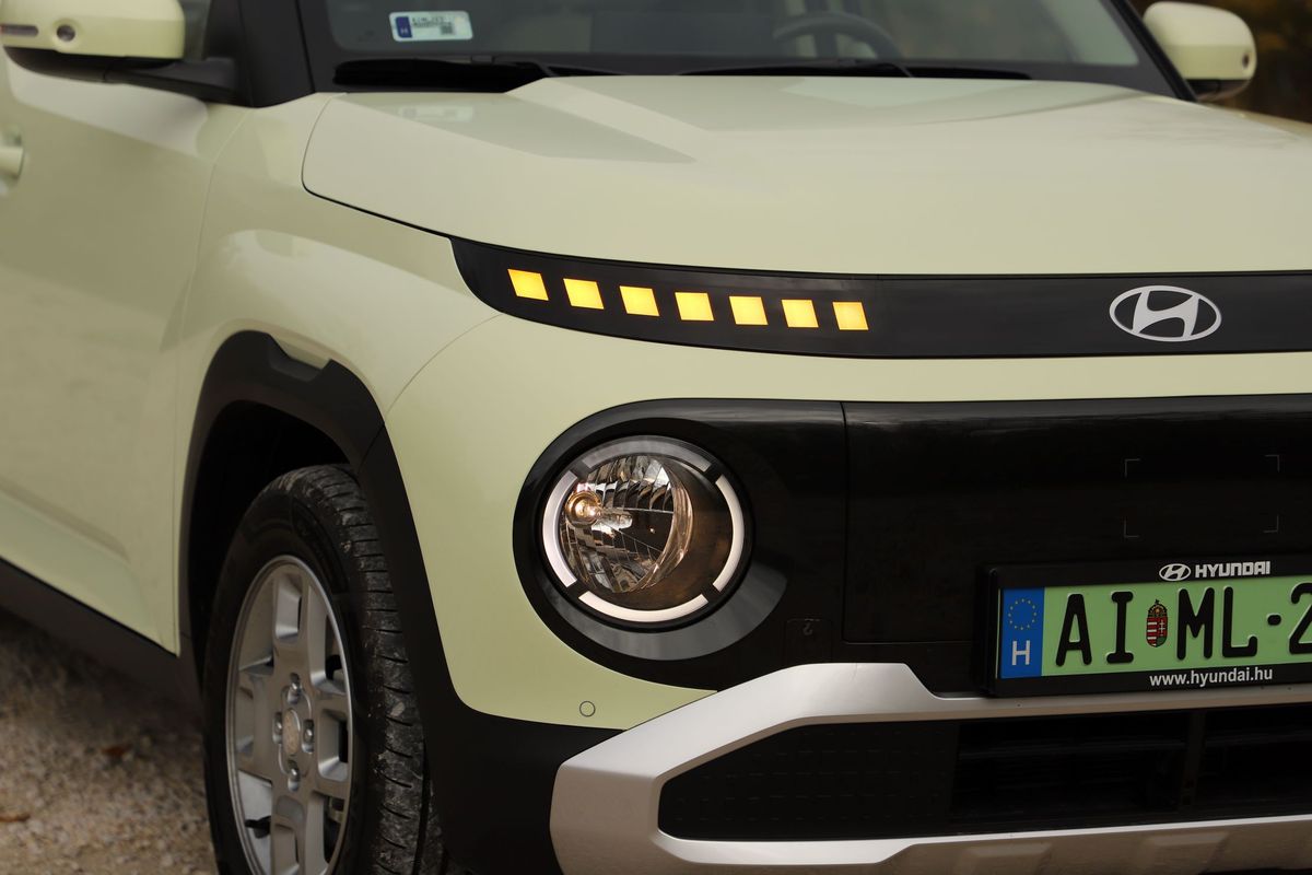 az Inster, a 2026-ban érkező Renault Twingo IV például csak három centivel rövidebb, de közel tíz centivel alacsonyabb és szélesebb nála, és a tengelytávja is 16 centivel hosszabb. A Hyundai tehát rövid, keskeny és magas, amiből nem nehéz kitalálni, hogy nagyrészt városi használatra szánták a tervezői. Szerencsére a formaterv jól sikerült, a karakteres, kedves arcával az Inster kitűnik a tömegből, és a vajszínű fényezés is jól áll neki. A fényszórók és nappali fények a kerek, lenti lámpafészkekben kaptak helyet, a pixeles irányjelzők fölöttük szemöldöknek tűnnek az arcon. Számos érdekes részletet lehet még fellelni a karosszérián a kagyló alakú motorháztetőtől a kiszélesített kerékjáratokon át a pókszemekre hasonlító pixeles hátsó lámpákig. Jópofák a négyküllős felnik, amelyek visszafogott, 15 colos méretűek, így szinte elvesznek a nagy, fekete kerékjáratokban.