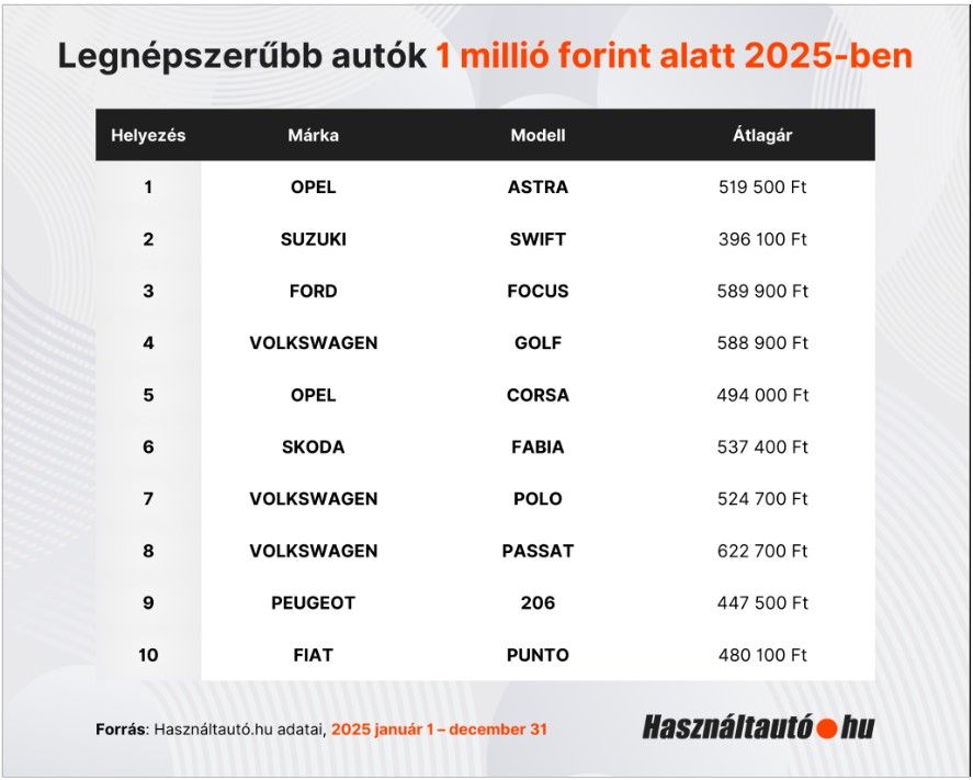 2025-ben az egymillió forint alatti kategóriában a legtöbb érdeklődés az Opel Astra hirdetéseire érkezett: közel 94 ezer érdeklődést regisztráltak, miközben a modellből több mint 11 ezer aktív hirdetés volt elérhető. Egy évvel korábban még a Suzuki Swift vezette a rangsort, amely 2025-re ugyan visszacsúszott a második helyre, de továbbra is 86 ezer feletti érdeklődőt vonzott. A „mi autónk” pozíciója különösen figyelemre méltó, hiszen továbbra is ez az egyik legolcsóbb modell a mezőnyben. Az átlagár 2025-ben is négyszázezer forint alatt maradt, és az alacsony belépési ár önmagában is erős vonzerőt jelent ebben a szegmensben.