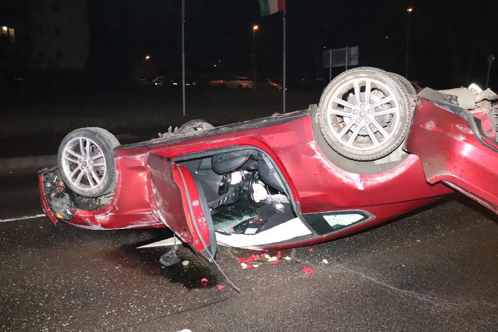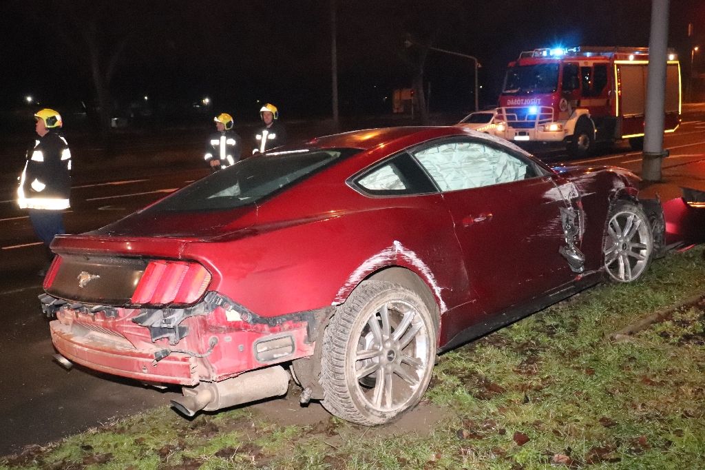 Február másodikán hajnalban egy férfi nagy sebességgel hajtott a XIII. kerületi Váci úton, majd megcsúszott, és a forgalmi sávokat elválasztó járdaszigetnek ütközött. Ekkor – a képek tanúsága szerint – kiszakadt a bal első kerék felfüggesztése, a Ford Mustang pedig felborult, és a tetején csúszva állt meg keresztbe fordulva az úttesten; az ütközésben minden légzsákja kinyílt.