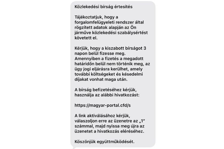Egyre inkább terjednek, és mind több jóhiszemű áldozatot szednek az internetes csalások, immár a hazai gépjármű-tulajdonosok körében is. Már sokadszor figyelmeztet a Magyar Biztosítók Szövetsége (Mabisz) a pénz megszerzésére vagy adathalászatra irányuló üzenetekre, és néhány napja ugyanígy tett a rendőség is. Közlekedési bírság befizetéséről szól üzeneteket kapnak az érintettek, mely hivatalosnak tűnő, ám átverős linkre irányítanak (magyarorszgpolice.bond/hu, police-hun.xyz/s, hungarypolicei.cfd/s, valamint magyar-portal.cfd/s). Újabb nyomozás indult az ügyben, a rendőrség pedig figyelmezet, hogy nem üzenetekben, hanem mindig hivatalos úton (posta, Ügyfélkapu) kommunikál.