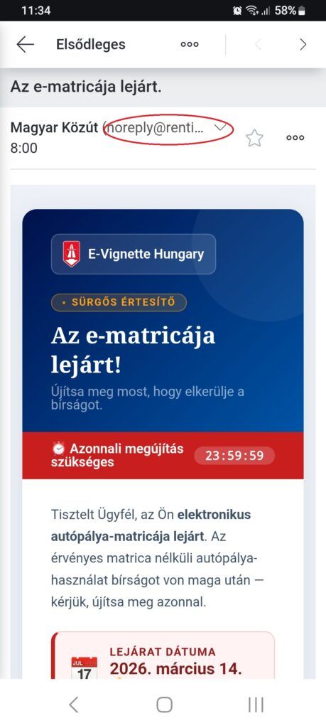 Legutóbb a Magyar Közút is közleményt adott ki az ügyben, miután tömegesen kapja a lakossági bejelentéseket „az e-matricája lejárt” szöveggel érkező internetes csaló sms-ek és e-mailek miatt. Ezek az üzenetek mindig sürgető hangvételűek, azonnali megújításra szólítanak fel, és akár 165 ezer forintos bírsággal fenyegetnek. Bár gyanús lehetne a nem hivatalos domain vagy a külföldi körzetszám, sokan bedőlnek a trükknek, különösen, ha a nemzeti útdíjfizetési rendszer név is szerepel abban. Fontos, hogy senki se kattintson a kamu üzenetben található linkre, semmilyen adatot (főleg bankkártyáét) ne adja meg, emellett ügyelni kell a jelszavak titkának megőrzésére.