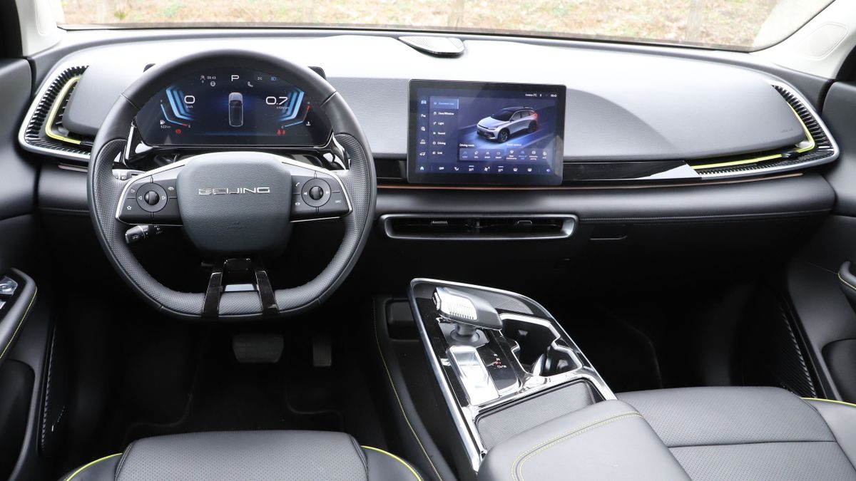 Szerencsére a műszerfalon sem vitték túlzásba az ázsiai stílust, de már digitális belsőről van szó, fizikai kapcsolókat csak az ajtókárpiton és a kormány küllőin lehet találni. A kezdőképernyőről úgy érhető el leggyorsabban a klíma digitális vezérlője, hogy alulról „felhúzzuk” azt, míg a járműbeállítások (itt lehet kikapcsolni például a sebességtúllépés-figyelmeztetést) eléréséhez felülről kell „lehúzni” a menüt. Nem véletlen az okostelefonos párhuzam, hiszen ez az autó használta először a Huawei által kifejezetten autók számára fejlesztett HarmonyOS operációs rendszert. A próbált autóban az indukciós telefontöltő mellett még USB-A csatlakozók voltak.