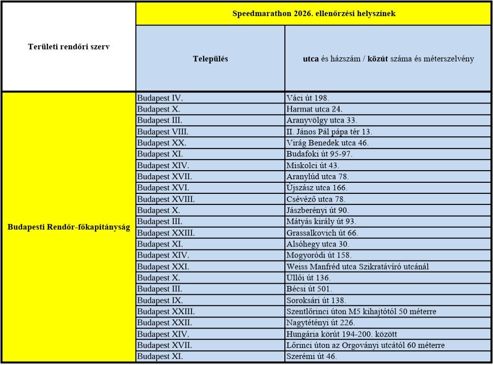 Egész héten gyorshajtókra vadászik a magyar rendőség a nemzetközi ROADPOL (Európai Közlekedésrendészeti Szervek Hálózata Műveleti Csoport) akció keretében, hogy csökkenték a sebességtúllépés miatt bekövetkező balesetek számát, melynek szomorú aktualitást ad a nemrég a Váci úton bekövetkezett halálos karambol. Lesz a műveletben egy kiemelt, 24 órás fokozott ellenőrzést jelentő úgynevezett Speedmarathon nap is, mégpedig április 15-én szerdán, ekkor az ellenőrzés reggel 6 órától másnap hajnalig tart. A helyszínek kijelölésénél nem csak a vármegyei kapitányságok tapasztalatait, hanem a számtalan állampolgári javaslatot is figyelembe vették, most pedig a Police.hu oldalon közzétették a traffipaxpontok listáját. Vármegykénként a linkekre kattintva nyithatók meg a táblázatok, a budapesti helyszíneket pedig külön megmutatjuk: