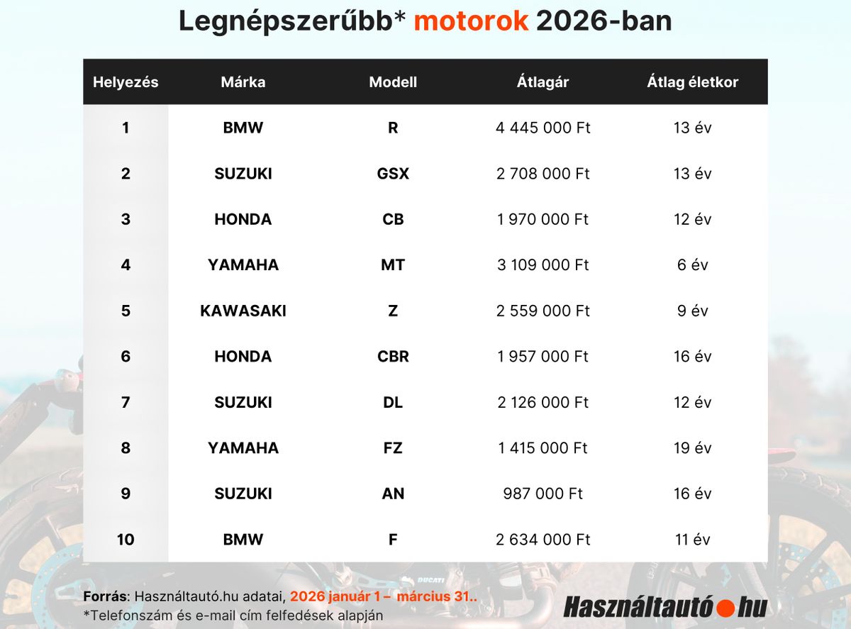 Aki használt motor vásárlása előtt áll, és szeretne spórolni, jobban teszi, már a kellemes idő beköszönte előtt nekiáll a keresgélésnek. Pontosan az ilyen érdeklődők preferenciáit vizsgálta a Használtautó.hu oldalt működtető csapat az idei első negyedév adatai alapján, és úgy fest, hogy továbbra is (az amúgy az újmotor-eladásokat is vezető) BMW R-sorozatú túraendurók a legnépszerűbbek: borsos, átlagosan 4,5 millió forintos áruk dacára is kétszer annyian szemeztek velük, mint a listán második helyezett (a bivalyerős Hayabusákat is magába foglaló) Suzuki GSX modellcsalád különféle változataival.