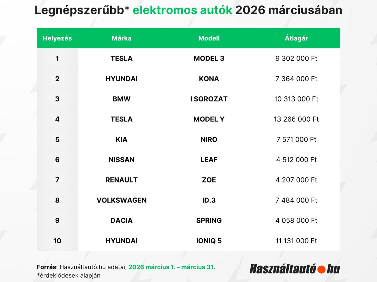 Persze a magyar piacon az árérzékenység továbbra is meghatározó szempont, az olcsóbb, idősebb elektromos modellek, mint például a Nissan Leaf, a Renault Zoe és a Dacia Spring 2026 első három hónapjában végig a legkeresettebb modellek között szerepeltek. Ám a trendfordulót jelzi, hogy a már említett nagyobb hatótáv mellett a tágasabb, családbarát méretű, vagyis első autóként is használható típusokra egyre nagyobb az érdeklődés. Éppen emiatt idővel komoly kereslete lehet majd a kínai gyártmányoknak, egyelőre azonban még csak a top 20-ba fértek bele az MG és a BYD fiatalabb modelljei. „Az elmúlt időszak piaci folyamatai, különösen az olajválság és az üzemanyagárak emelkedése alapján arra számítottunk, hogy jelentősen megnő az érdeklődés az elektromos járművek iránt, és a várakozásaink beigazolódtak” – mondta Koralewsky Márk, a Használtautó.hu vezetője, amit kiegészítenénk azzal, hogy sokakat vonz az otthoni vagy munkahelyi töltés spórolási potenciálja is.