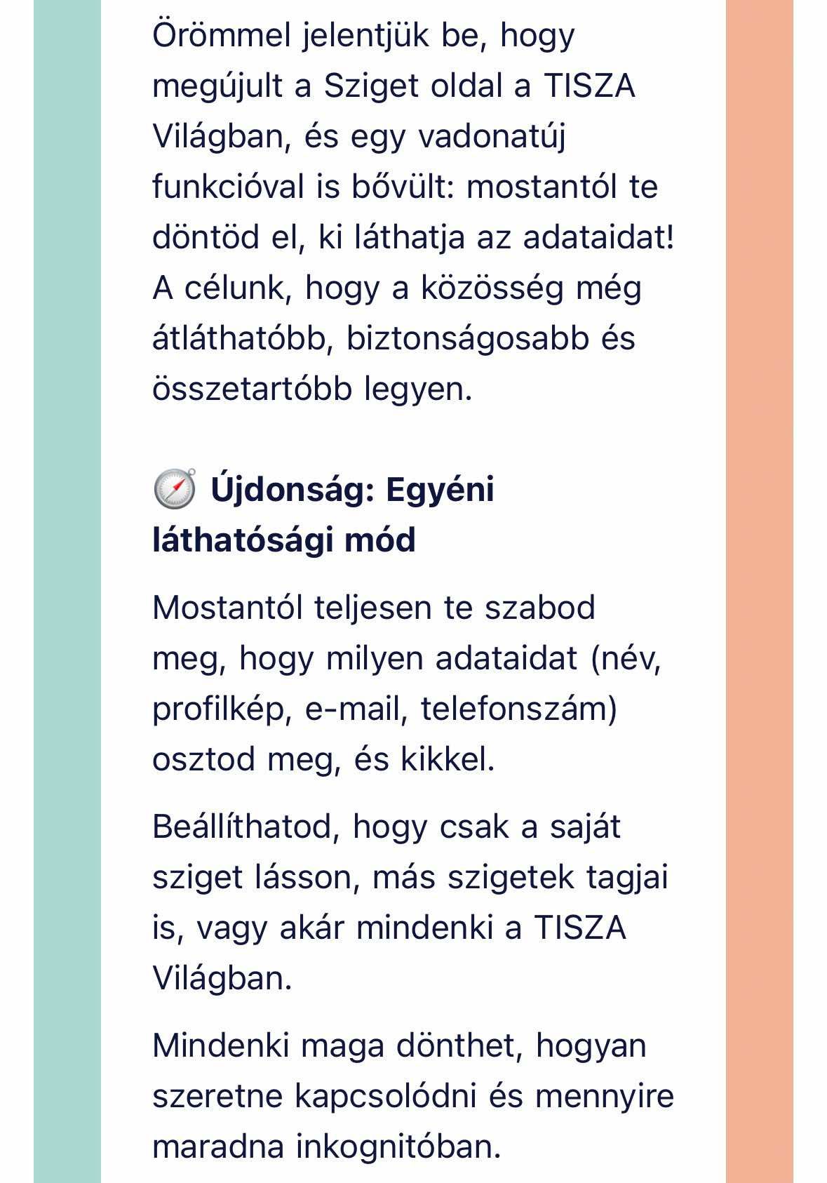 – Örömmel jelentjük be, hogy megújult a Sziget oldal a Tisza Világban, és egy vadonatúj funkcióval is bővült: mostantól te döntöd el, ki láthatja az adataidat! A célunk, hogy a közösség még átláthatóbb, biztonságosabb és összetartóbb legyen – írta körlevelében a Tisza Párt.