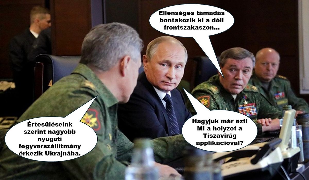 Deák Dániel egy másik mémet is bemutatott, amely szerint „Magyar Péter választ adott arra, miért haladnak lassan az oroszok az ukrán fronton: Putyint lefoglalja a Tisza Világ mobilalkalmazás!”