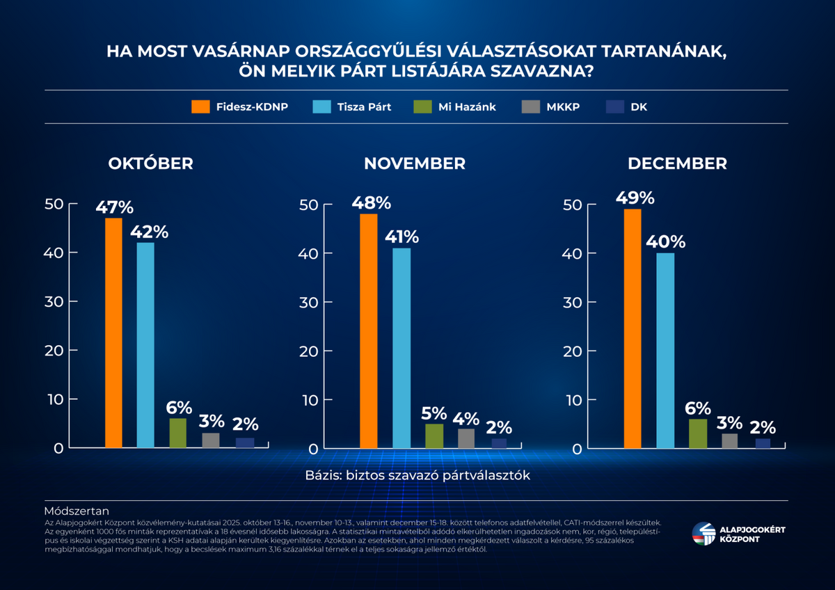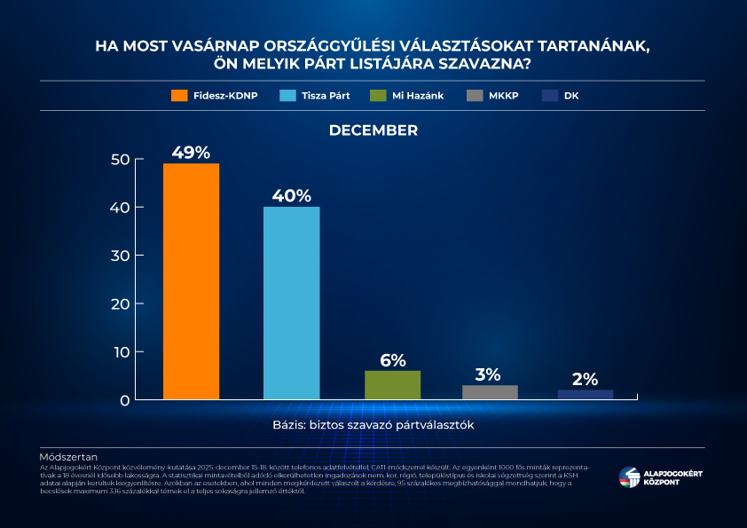 A Fidesz–KDNP országos listáját a biztos szavazó pártválasztók 49 százaléka támogatná egy most vasárnap esedékes választáson, míg a Tisza Pártra csak negyven százalékuk voksolna – derült ki az Alapjogokért Központ friss, országosan reprezentatív közvélemény-kutatásából. A felmérés szerint a kormánypártok népszerűsége az előző, novemberi adatfelvételhez képest egy százalékponttal nőtt, míg a baloldali megszorításokat tervező és a brüsszeli háborús koalíció részeként mozgó Tisza támogatóinak aránya ugyanennyivel csökkent.