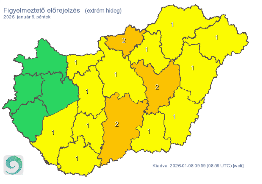 Emellett több helyen is extrém hideg reggelre ébredünk, a legdurvább helyzetre Jász-Nagykun-Szolnok, Nógrád, és Bács-Kiskun vármegyékben kell számítani, ezeken a területeken akár mínusz húsz foknál is hidegebb lehet.
