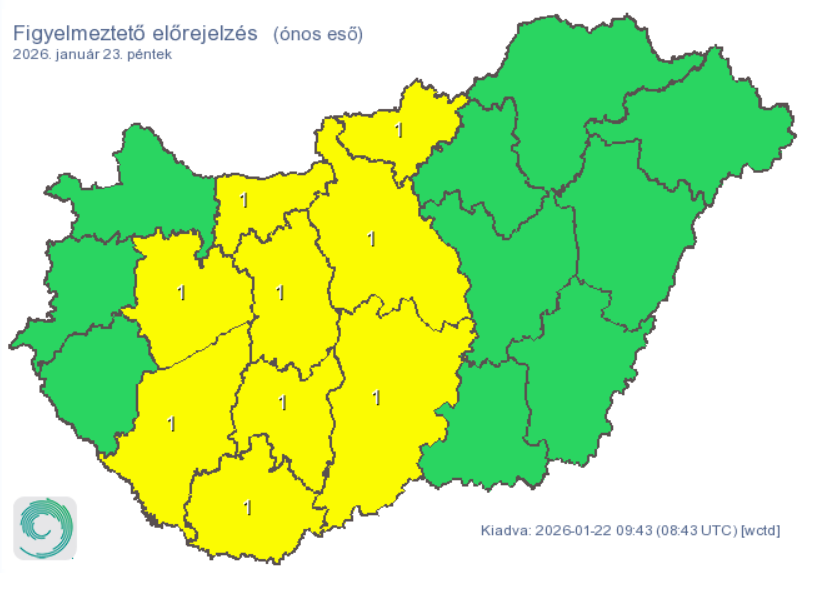 Hozzáfűzik, az Észak-Dunántúlon napközben helyenként élénk lökések kísérhetik a keleties szelet. A HungaroMet ónos eső veszélye miatt kilenc vármegyére adott ki elsőfokú figyelmeztetést, ezek: Komárom-Esztergom, Veszprém, Somogy, Fejér, Tolna, Baranya, Nógrád, Pest, és Bács-Kiskun.