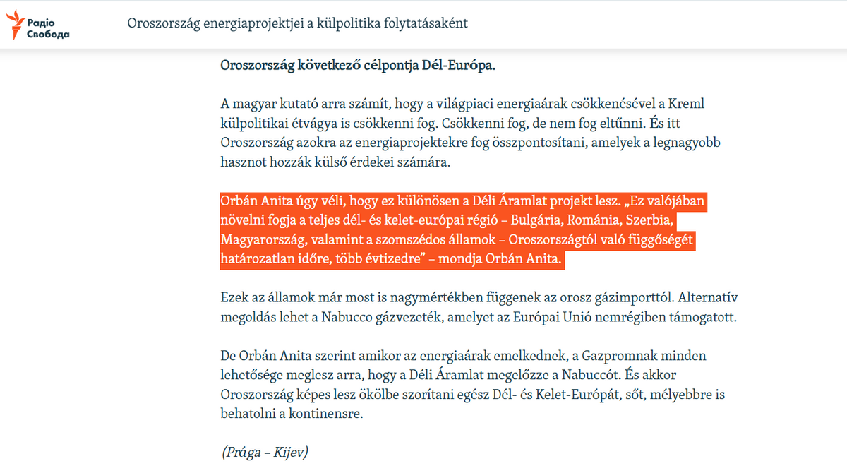 Az Ellenpont felidézte: az orosz Gazprom és európai partnerei a kétezres évek második felében kiépítettek volna egy a földgázvezetéket, amelyben Ukrajnát megkerülve közvetlenül Dél- és Kelet-Európába szállították volna az orosz földgázt a Fekete-tenger alatt. – Bár a projektnek számos előnye lett volna, többek között növelte volna a kontinens gázellátásának biztonságát, végül nem valósult meg. Orbán Anita az említett interjúban beállt a kórusba, az amerikai külpolitikai érdekek mentén – írták. Hozzátették, azzal érvelt, hogy a Kreml energiaprojektjén keresztül határozatlan időre, több évtizedre magához láncolná a teljes dél- és kelet-európai régiót.