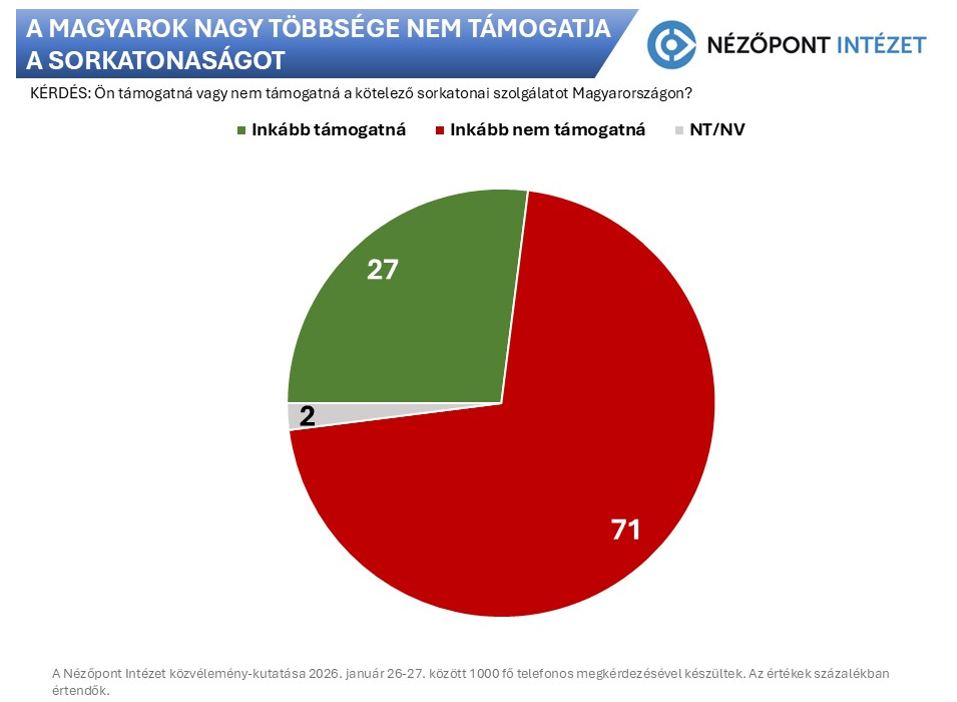 A Nézőpont Intézet közvélemény-kutatásban vizsgálta meg a sorkatonaság esetleges visszaállításának társadalmi megítélését Magyarországon. Az eredmény egyértelmű népszerűtlenséget mutat a magyarok körében, hiszen