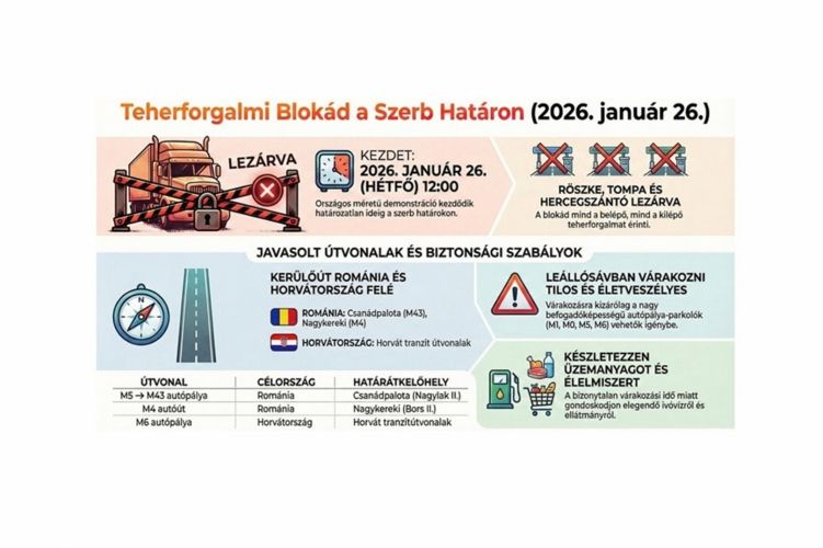 A szerb, bosznia-hercegovinai és montenegrói fuvarozók szövetségének tagjai 2026. január 26-án (hétfőn) 12 órától határozatlan ideig országos méretű demonstrációt kezdenek. A magyar–szerb határszakaszon Röszke, Tompa, Hercegszántó teherforgalmi átkelőhelyei érintettek a blokádban mind a belépő, mind a kilépő irányú forgalom esetében – tájékoztatott a police.hu.