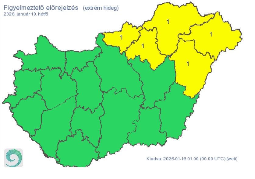 A Met.hu-n ugyanis már jól látszik, hogy vasárnapra elsőfokú figyelmeztetést adtak ki Szabolcs-Szatmár-Bereg vármegyére extrém hideg miatt, ami azt jelenti, hogy a hőmérséklet ott –15 fok alá csökkenhet.