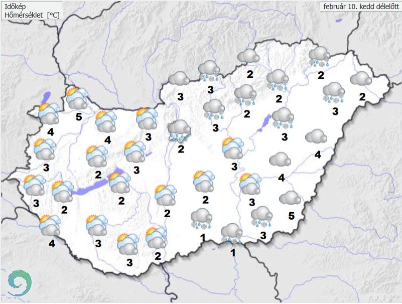 Kedden általában erősen felhős vagy borult idő valószínű, inkább csak kevés helyen és kis eséllyel szakadozhat fel hosszabb időre a felhőzet – derül ki a HungaroMet Zrt. előrejelzéséből. Egyre inkább a Dunától keletre fordulhat elő kis mennyiségű vegyes halmazállapotú csapadék – eső, havas eső, hóesés egyaránt – , amely délután ott is megszűnik a legtöbb helyen. A déli, délkeleti szelet napközben már több helyen élénk, főleg a déli vidékeken és az Észak-Dunántúlon helyenként erős lökések is kísérhetik. A legmagasabb nappali hőmérséklet 2 és 9 fok között várható. Késő estére többnyire 0 és +5 fok közé hűl le a levegő.