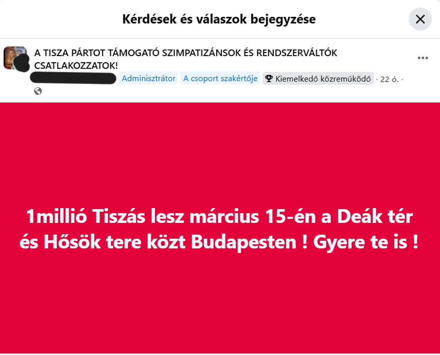 A bejegyzés azzal a képtelen állítással rukkolt elő, hogy a Tisza Párt sebtiben, közvetlenül a Békemenet meghirdetése után kihirdetett demonstrációján egymillió ember fog megjelenni. A Facebookon meghirdetett eseményre mostanáig azonban