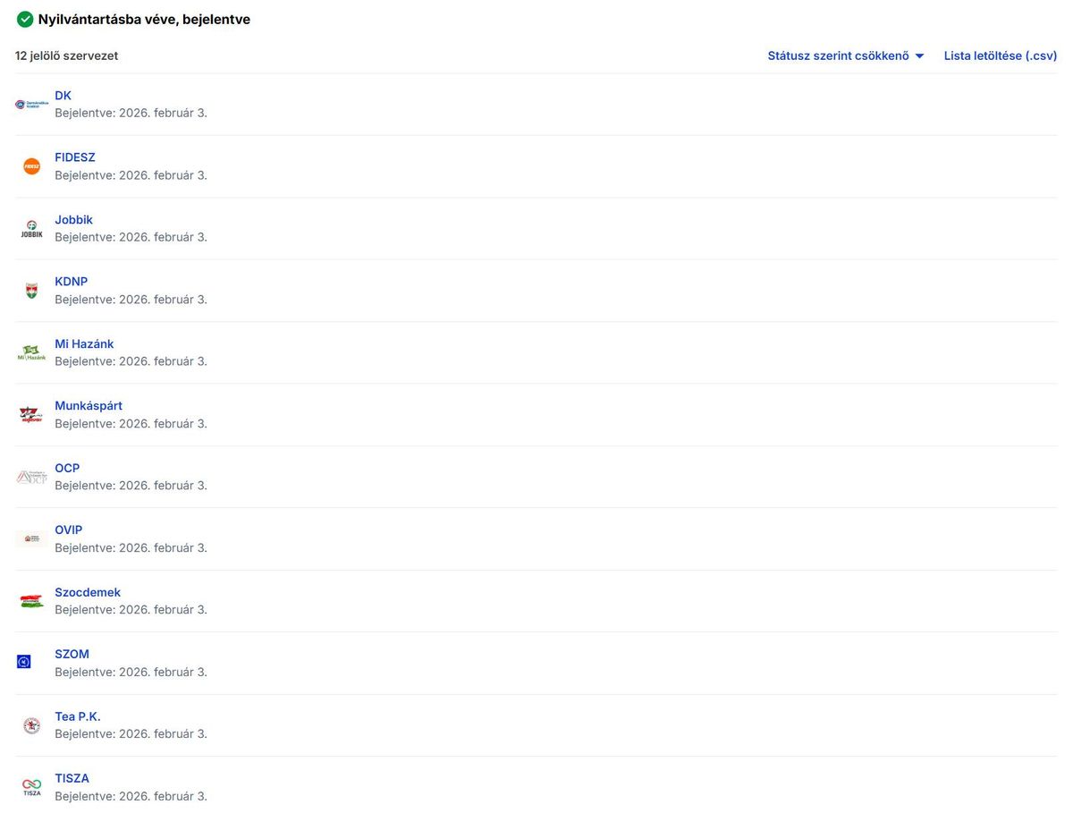 A listán szerepel a Fidesz, a KDNP – Kereszténydemokrata Néppárt, a Tisza, a Demokratikus Koalíció, a Jobbik valamint a Mi Hazánk Mozgalom is.