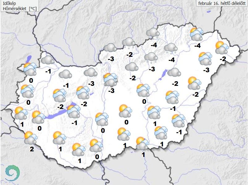 Vékony, olvadozó (tapadó) hóréteg ezeken a tájakon összejöhet. A déli, délkeleti szél főként az Észak-Dunántúlon élénkülhet meg. A legmagasabb nappali hőmérséklet -1 és +7 fok között várható, északkeleten lesz hidegebb, délnyugaton enyhébb az idő. Késő estére -3 és +2 fok közé hűl le a levegő.
