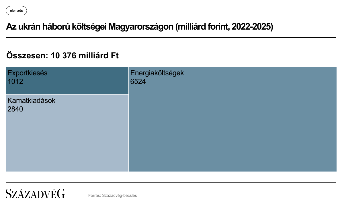 Négy éve tart az orosz–ukrán háború, amely komoly kiadásokat okoz a magyar családoknak is. A Századvég legfrissebb, 2025-ös adatokkal frissített elemzése szerint a háború okozta közvetlen károk mértéke Magyarországon mostanra elérte a 10 376,4 milliárd forintot.