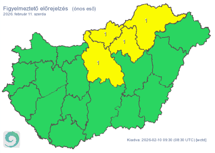 Számottevő csapadék egyelőre nem várható, majd hajnaltól előbb az északi, északkeleti részeken, szerda napközben pedig már másutt is megnövekszik a csapadék esélye. A főváros és az Északi-középhegység tágabb térségében eleinte vegyes halmazállapotú csapadék is előfordulhat – havas eső, hó, reggelig néhol ónos eső, fagyott eső –, majd ezeken a tájakon is egyre inkább az eső válik jellemzővé. Emiatt négy megyére figyelmeztetést is kiadtak. A délies szelet élénk, napközben helyenként erős lökések kísérhetik.