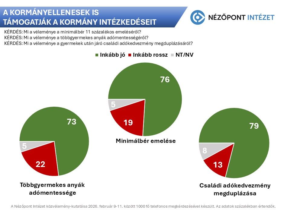 – derült ki a Nézőpont Intézet legfrissebb felméréséből. Mint írták, a rezsistop meghirdetése, majd a 13. és 14. havi nyugdíjak folyósítása mellett a fenti három, a lakosság széles körét kedvezően érintő kormányzati intézkedés vette kezdetét 2026 első hónapjaiban.