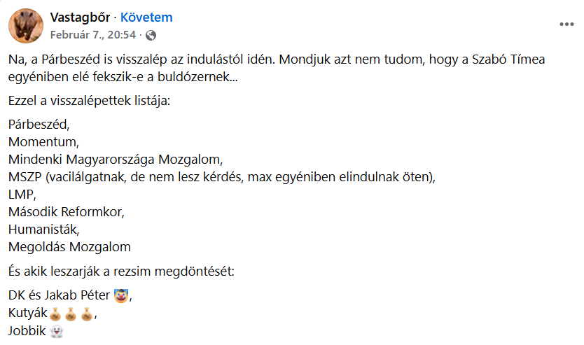A forrás szerint a Tisza Párt érvelése arra épül, hogy az ellenzéki oldalon a szavazatok megoszlása veszélyeztetheti a győzelmi esélyeket, és ezért „koordinált indulásra” lenne szükség. Az informátor ugyanakkor azt állítja, hogy a felvetés nem pusztán együttműködési javaslatként hangzott el, hanem erőteljes politikai elvárásként. Láthatóan a Kutyapárt részéről is érezhető a rájuk nehezedő nyomás, ugyanis nemrég Nagy Dávid, az MKKP pártigazgatója mindenkit arra kért, egyéniben ne rájuk szavazzanak, hanem más ellenzéki jelöltekre, és csak listán támogassák az MKKP-t.