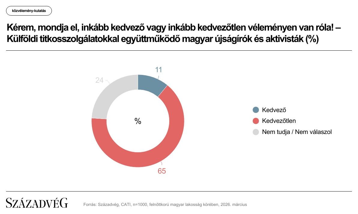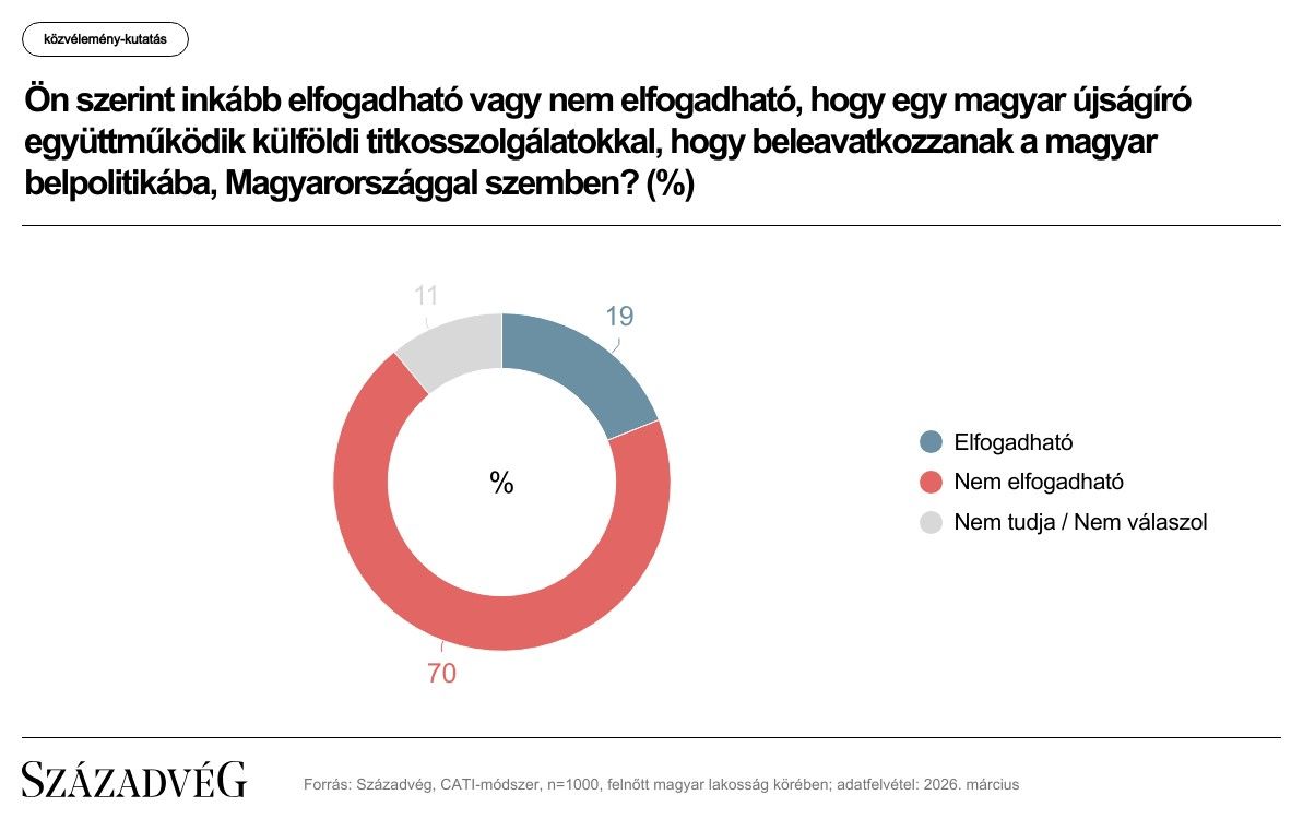 A választópolgárok 70 százaléka szerint nem elfogadható, hogy egy magyar újságíró együttműködik külföldi titkosszolgálatokkal, hogy azok beleavatkozzanak a magyar belpolitikába, Magyarországgal szemben – derül ki a Századvég friss kutatásából.