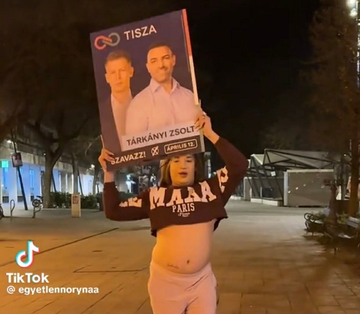 A felvételen az influenszer azt skandálja, „árad a Tisza”, majd pedig a „Le Orbánnal” rigmust is előrántja egy pillanatra, miközben a Tisza Párt Tárkányi Zsoltot és Magyar Pétert ábrázoló plakátját tartja a feje fölött.