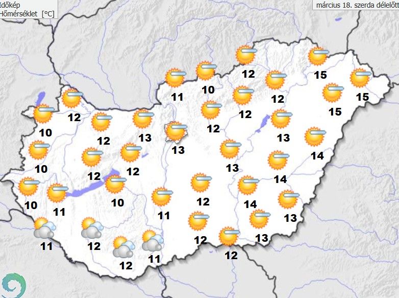 Szerdán a hajnali esők elvonulása után északkelet felől egyre naposabb időre számíthatunk, fátyolfelhőkkel. Az északkeleti szél sokfelé lesz élénk, néhol erős. 15 fok körül alakul a csúcshőmérséklet.