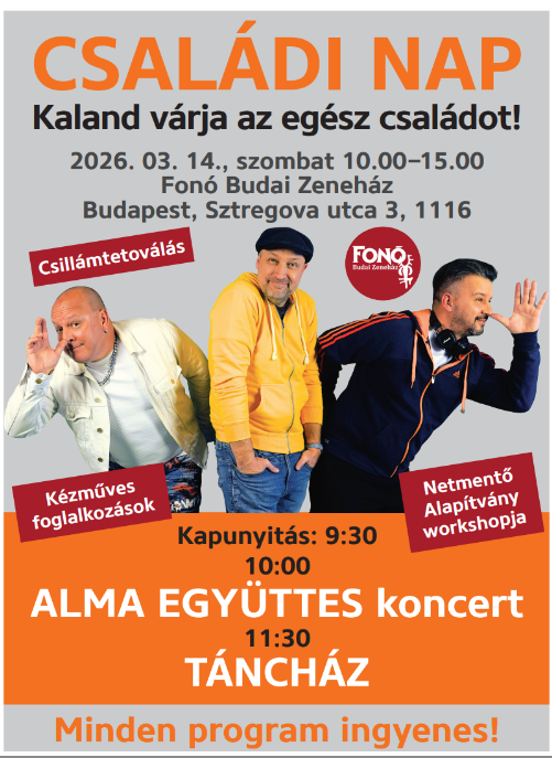Színes, tavaszi programokkal várják az érdeklődőket március 14-én, szombaton a Fonóban, ahol egy egész napos családi rendezvény kínál tartalmas kikapcsolódást gyerekeknek és felnőtteknek egyaránt. A szervezők célja, hogy közös élményekkel, zenével, tánccal és kreatív foglalkozásokkal teremtsenek vidám, közösségi hangulatot a családok számára.