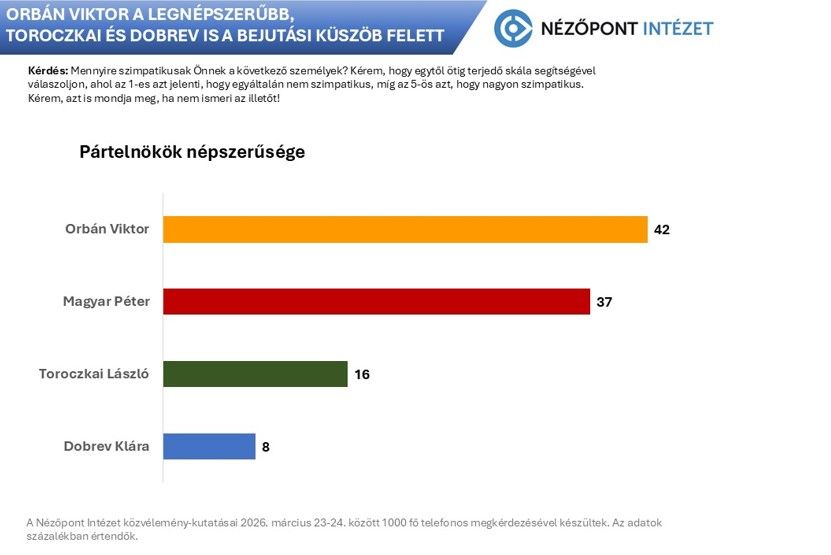 A parlamenti választások pártok közötti versenyére nem csupán az adott politikai formáció támogatottsága, hanem vezetőik népszerűsége is erős befolyással van. Ez különösen a kisebb, a parlamentbe jutás ötszázalékos küszöbének környékén ingadozó pártok esetében lehet sorsfordító, hiszen a listavezető kedveltsége lehet éppen az a faktor, ami végül az Országgyűlésbe segíti az adott pártot. A Nézőpont Intézet közvélemény-kutatása a Fidesz, a Tisza Párt, a Demokratikus Koalíció és a Mi Hazánk Mozgalom elnökének, egyben pártlistájuk vezetőjének népszerűségét mérte meg a 2026-os országgyűlési választás kampányában.