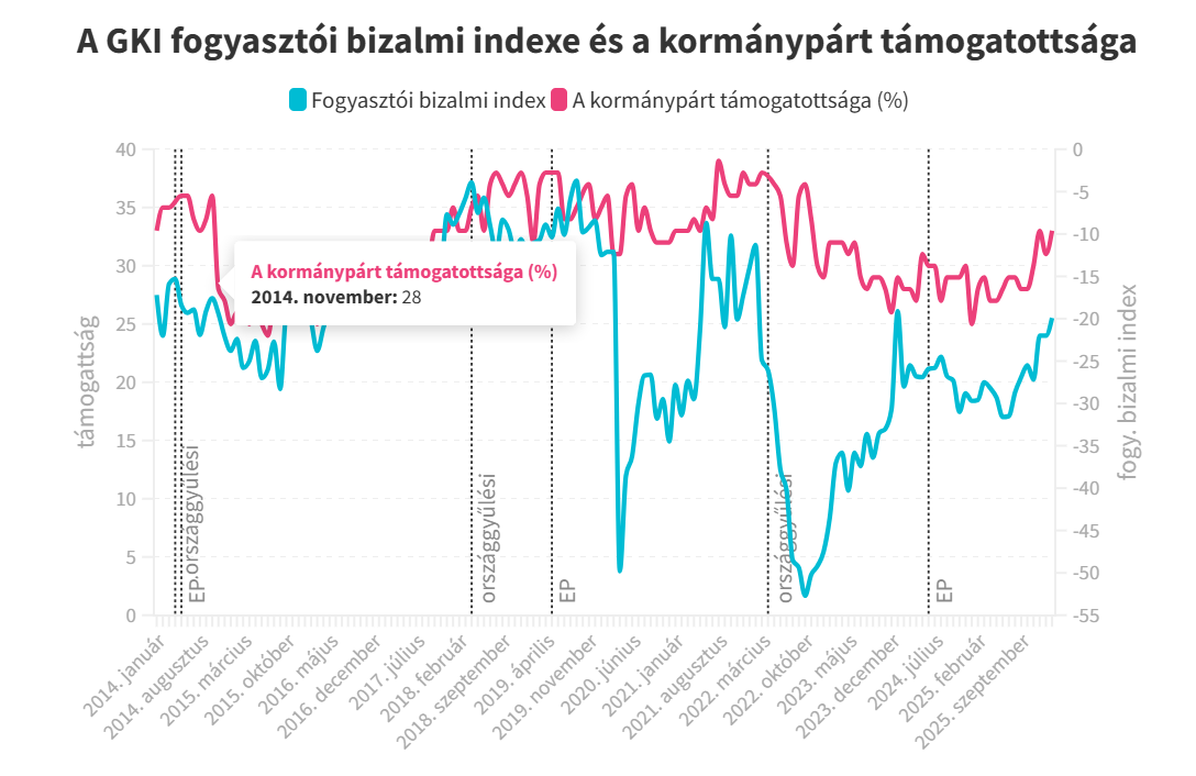 – vélekedett a balliberális lap, hozzátéve, hogy mind a Századvég, mind pedig a GKI indexei esetében az látszik, hogy a fogyasztói hangulat februárban már jobb volt, mint 2024 júniusában, az EP-választás idején és mint 2022 áprilisában, az előző országos parlamenti választás idején.