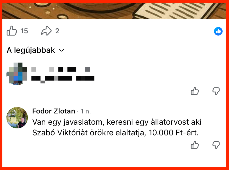 „Van egy javaslatom, keresni egy állatorvost, aki Szabó Viktóriát örökre elaltatja, tízezer forintért” – szúrta ki a CS3 portál egy szentesi tiszás aktivista, Fodor Zoltán álláspontját, aki a közösségi médián fenyegetőzött. A férfival szemben azóta eljárás indult, a rendőrség körözést adott ki ellene.