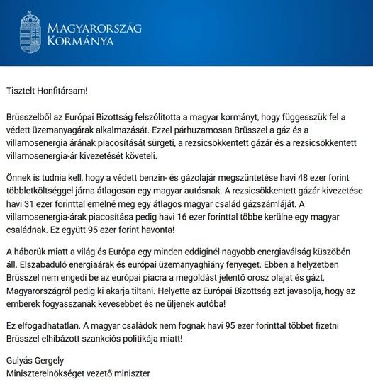 „Elfogadhatatlan! Az Európai Bizottság felszólította a magyar kormányt, hogy függessze fel a védett üzemanyagárak alkalmazását és a rezsicsökkentett gáz- és villanyár kivezetését követeli” – írta Gulyás Gergely Miniszterelnökséget vezető miniszter legutóbbi Facebook-bejegyzésében. A miniszter hozzátette: a döntés minden magyar családnak 95 ezer forint többletkiadást jelentene havonta.