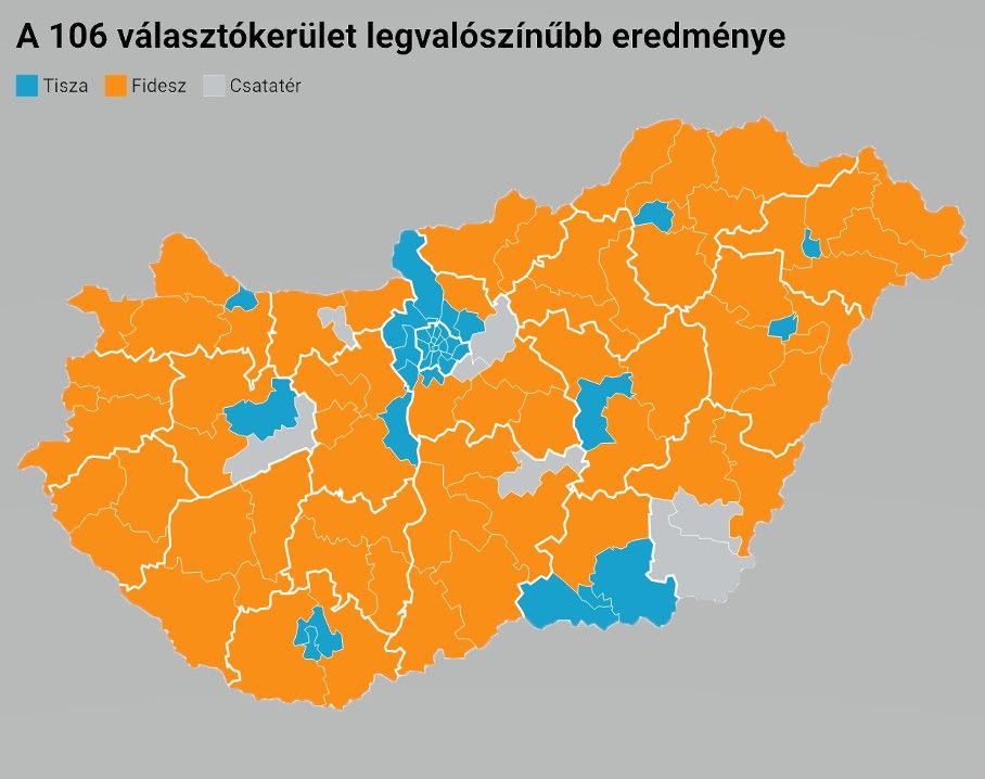 Az Alapjogokért Központ mandátumbecslése alapján az egyéni választókerületek egyértelmű többségében a Fidesz–KDNP jelöltje diadalmaskodhat az április 12-i országgyűlési választáson. A 106 választókerületből 64-ben a Fidesz–KDNP, 35-ben a Tisza arathat sikert, további hét körzetet pedig csatatérként azonosítottak. A jobboldali győzelem várható mértéke a választási rendszer egyéni ágán abba az irányba mutat, hogy Orbán Viktor ismételten stabil parlamenti háttérrel rendelkező kormányt alakíthat április 12-e után, amely képes Magyarországot kívül tartani a háborún, az energiaválság korában fenntartani az olcsó orosz olajat és gázt is magában foglaló többirányú beszerzési stratégiát, valamint a rezsicsökkentésen túlmenően az egykulcsos adó és adókedvezmények jelenlegi rendszerét is.