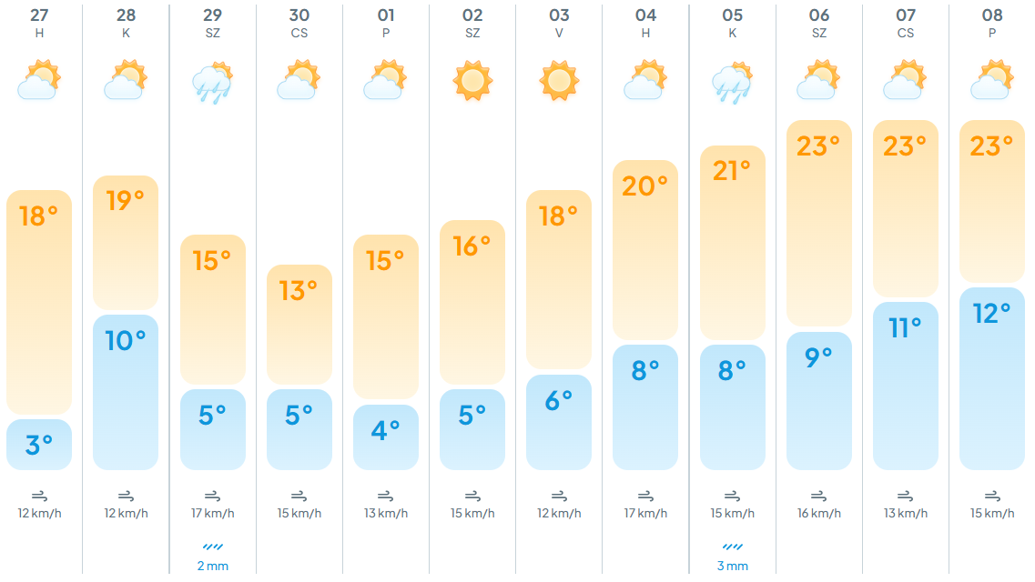 Közben a Köpönyeg arról számol be, hogy a hét első felében alapvetően nyugodtabb idő jön a vasárnapinál, de ne tegye el a kabátot, mert a levegő továbbra is hideg marad. Napközben többfelé kisüt a nap, délutánonként kellemes idő lesz, de reggelente még mindig sok helyen kell majd kabát. A fagyzugos területeken újra megjelenhetnek a gyenge fagyok.
