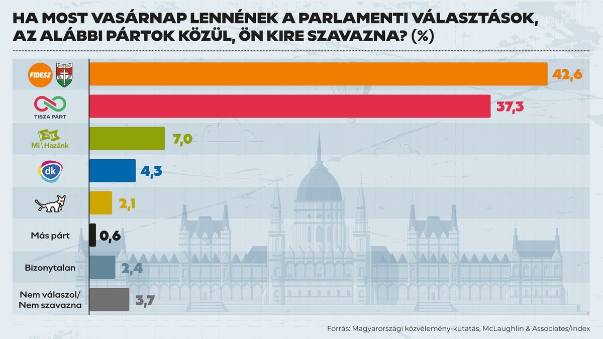 a vasárnapi országgyűlési választások előtt a Fidesz 42,6 százalékkal vezet, míg a Tisza 37,3 százalékkal követi.