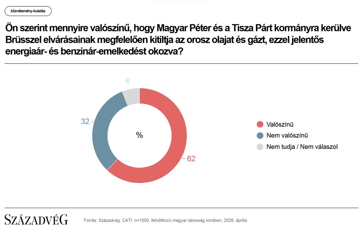 Kutatásában a Századvég azt is megkérdezte, hogy a válaszadók mennyire tartják valószínűnek, hogy egy esetleges Tisza-kormány Brüsszel elvárásainak megfelelően teljesen kitiltja Magyarországról az orosz olajat és gázt, ami jelentős energiaár- és benzinár-emelkedést okozna. A megkérdezettek 62 százaléka ezt elképzelhetőnek tartotta, 32 százalék szerint nem valószínű, míg hat százalék nem tudott vagy nem akart válaszolni.