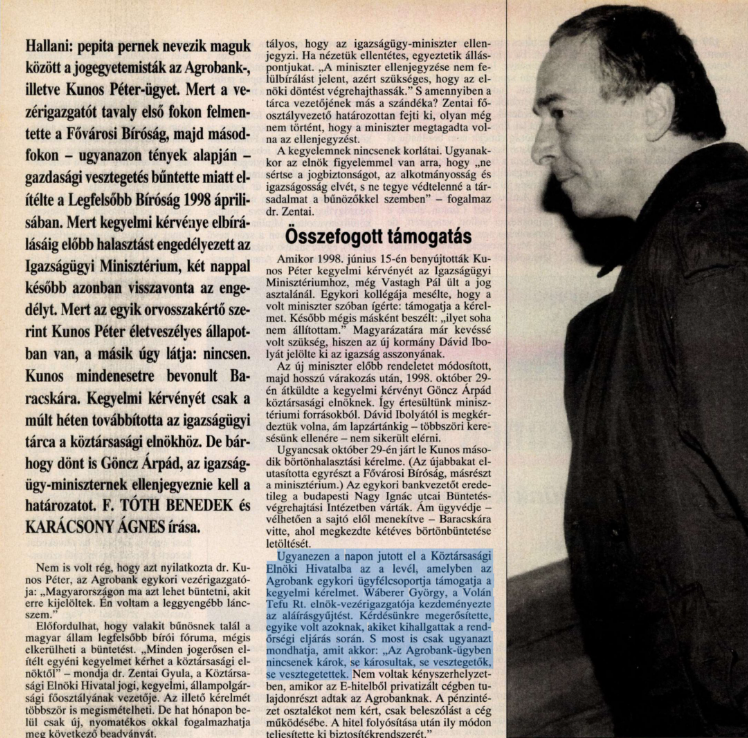 Az akkori balliberális sajtóban látványosan mentegetni próbálták Wáberer György patrónusát. A Népszava-cikkben konkrétan arra jutottak, hogy Kunos nem követett el jogellenes cselekményt. Nemcsak a médiában, hanem politikai szinten is megkezdődött az elítélt bankár mosdatása. Ebben kulcsszerepet vállalt a mostanában a Tisza Párt körül legyeskedő Wáberer György is: 1998 júniusában, még az ítélet előtt benyújtottak egy kegyelmi kérelmet az Igazságügyi Minisztériumhoz, amit sajtóértesülések szerint a szocialista tárcavezető, Vastagh Pál támogatott.