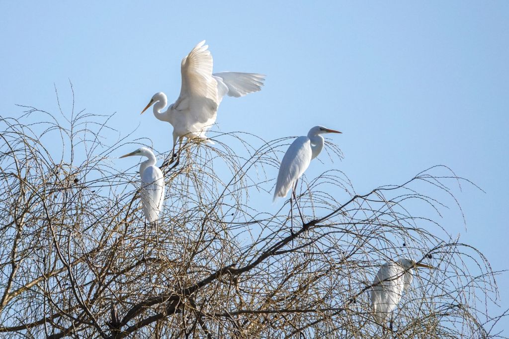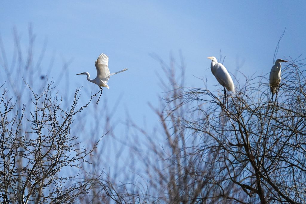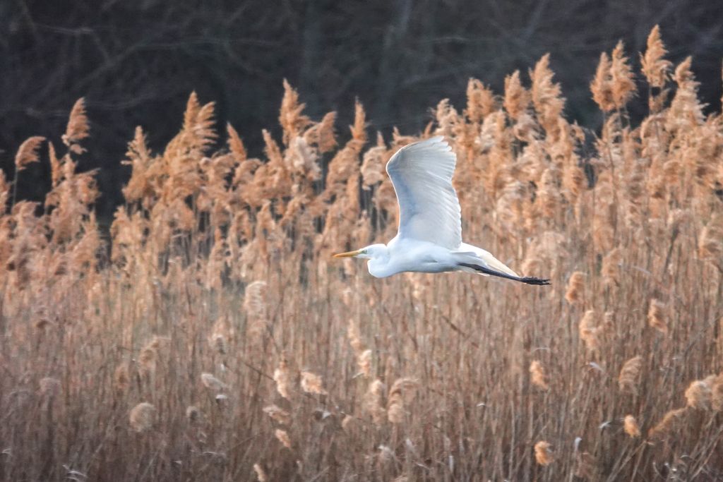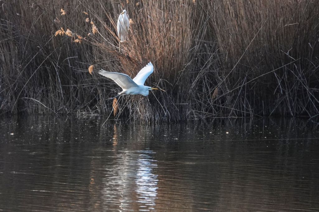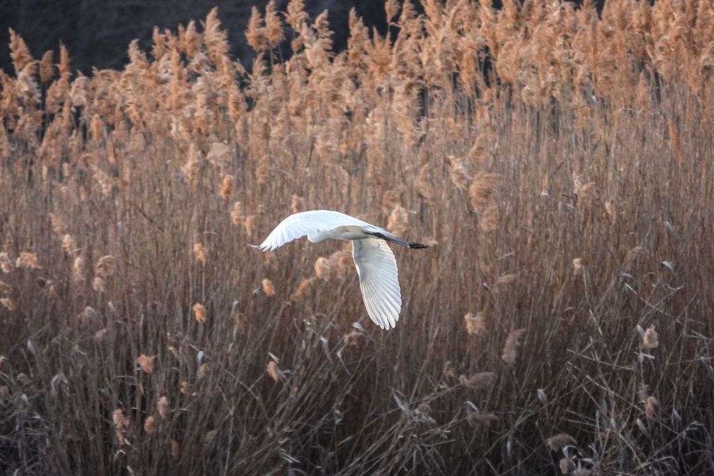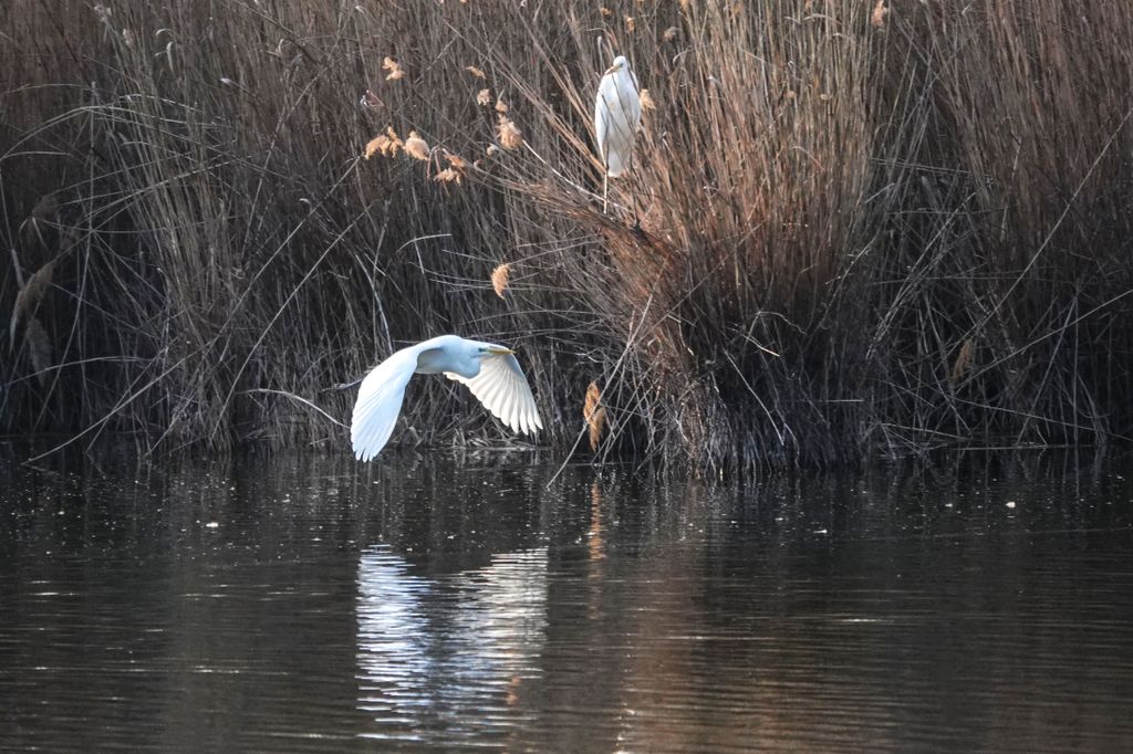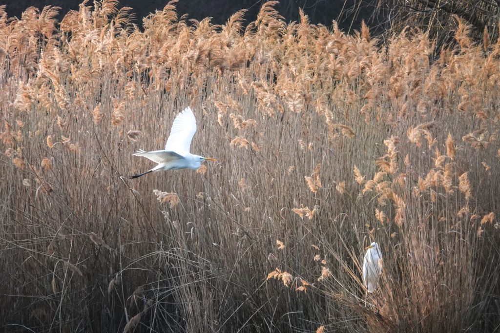 A képeken feltűnő madarak a magyar vizes élőhelyek ikonikus alakjai. Karcsú testük, hosszú nyakuk és elegáns röptük miatt már messziről felismerhetők. Amikor felszállnak, szárnyaik lassú, kimért mozdulattal hasítják a levegőt, mintha pontosan tudnák, hogy minden pillantás rájuk szegeződik. A nádas fölött áthúzó fehér sziluett különösen látványos a téli, barnás árnyalatú háttér előtt.