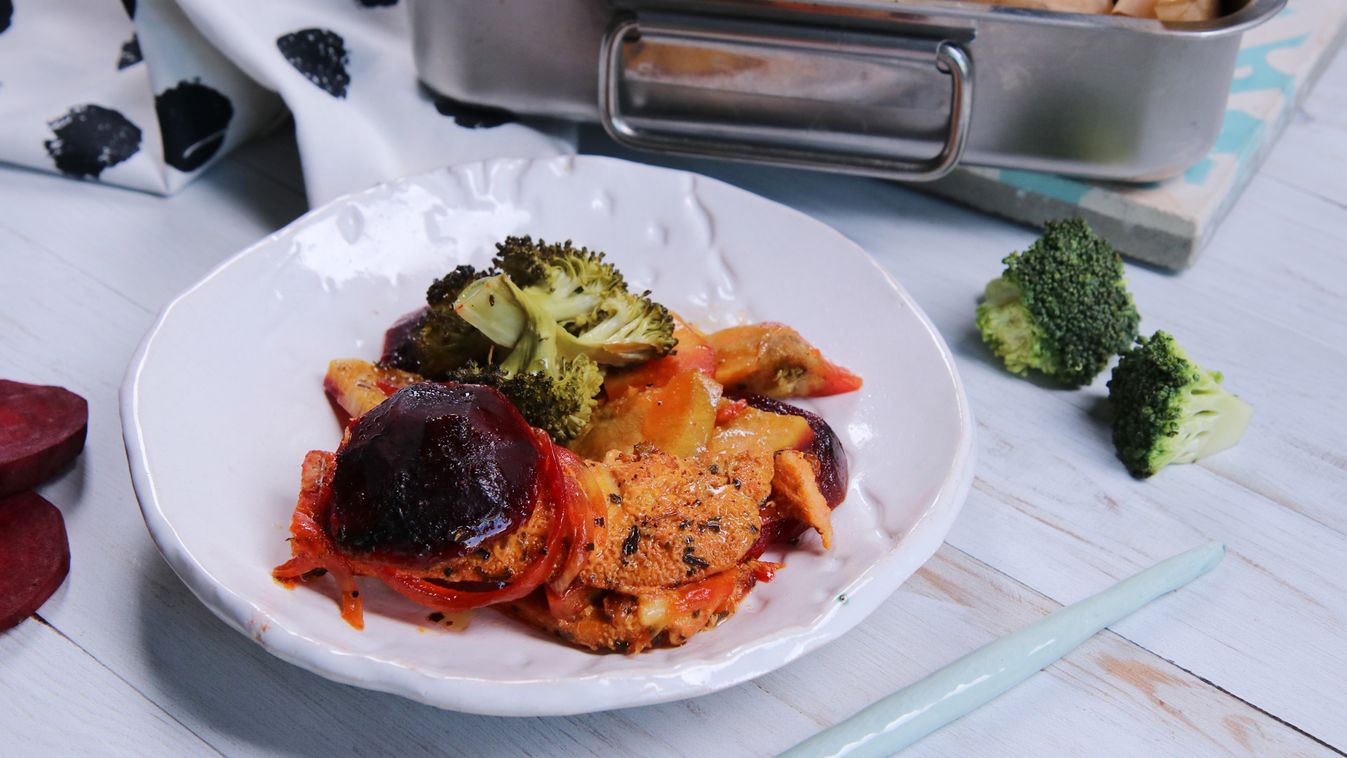Tepsiben sült céklás-édesburgonyás brokkolis csirkemell recept
