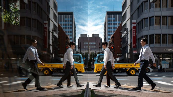 1/15 Utcai járókelők tükröződése Tokióban.