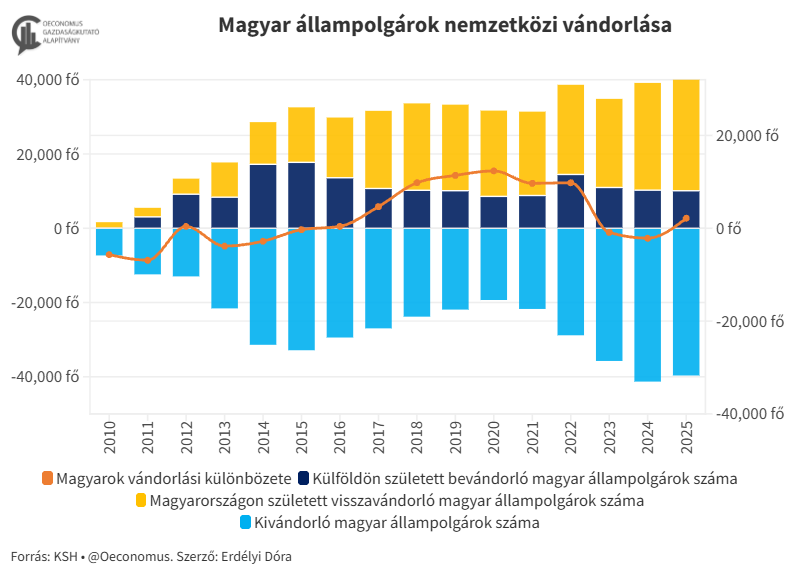 Ezzel együtt a magyar állampolgárok vándorlási egyenlege (elvándorlók és bevándorlók közti különbség) kismértékben pozitívban állt 2025-ben a 2024-es deficitet követően.