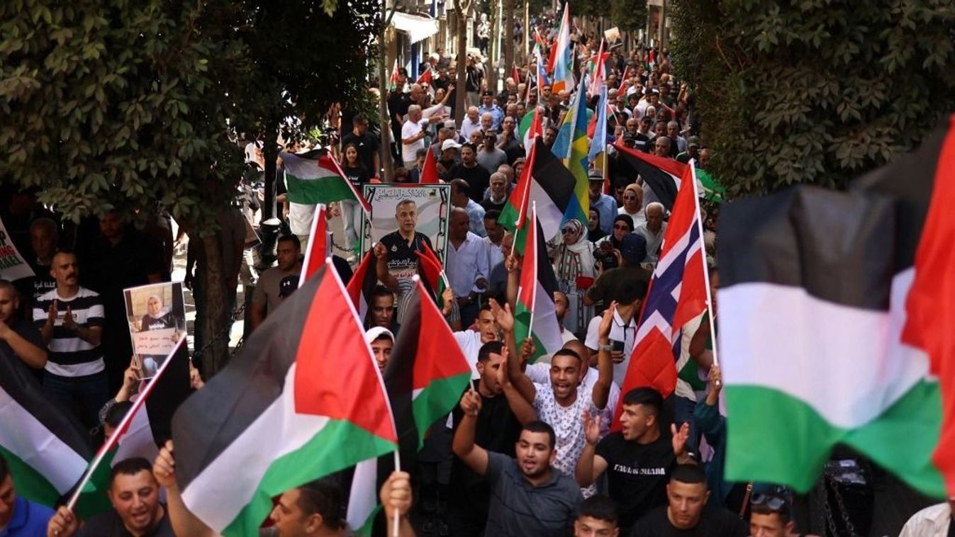 Borítókép: Palesztinok jelszavakat skandálnak egy gyűlésen Rámalláhban (Fotó: AFP)