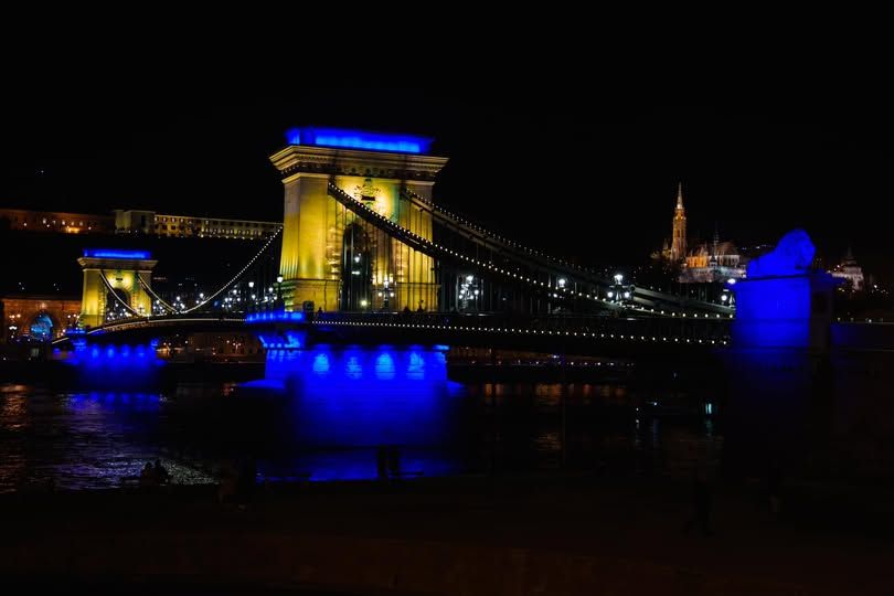 A budapesti Lánchíd Ukrajna színeiben. Forrás: Facebook/Karácsony Gergely