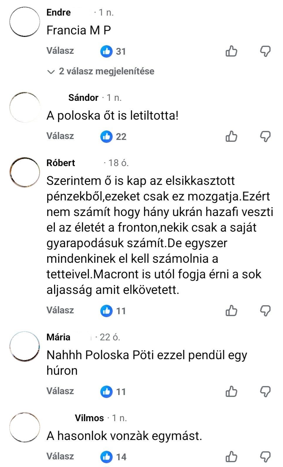 Szerintem ő is kap az elsikkasztott pénzekből, ezeket csak ez mozgatja. Ezért nem számít, hogy hány ukrán hazafi veszíti el az életét a fronton, nekik csak a saját gyarapodásuk számít. De egyszer mindenkinek el kell számolnia a tetteivel. Macront is utol fogja érni a sok aljasság, amit elkövetett