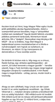 Egy olvasónk vette észre Szánthó Miklós, az Alapjogokért Központ főigazgatója felháborodását a Szuverenitásvédelmi Digitális Polgári Kör zárt Facebook-csoportjában. Az ügy előzménye, hogy a Tisza Párt tanácsadója önkényesen az ukrán uniós csatlakozásról tárgyalt Varsóban. Az agrároligarcha Raskó György, aki pénzzel is támogatja Magyar Pétert, már korábban is elbagatellizálta az ukránok uniós csatlakozása jelentette veszélyeket – most úgy tűnik, a saját kezébe vette az irányítást.
